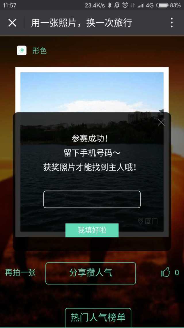 1.参赛者在形色活动页面,(苹果手机用户在侧边栏活动中心参与,安卓手机用户在花间页面上方的banner参加),上传一张自己拍摄的风景照片(手机、相机都可以)。上传照片,填写拍摄地,然后点击完成按钮,填写手机号码,再分享给好友,才能看到自己的图片。