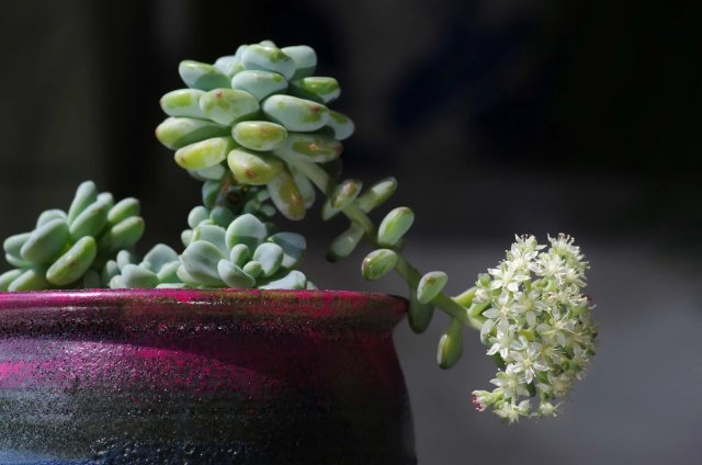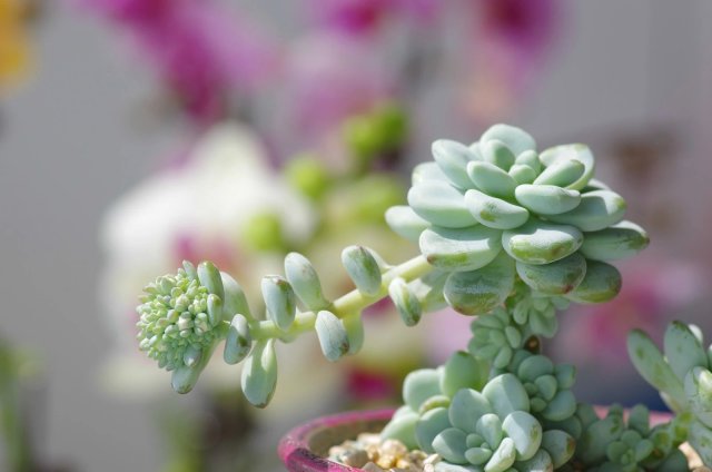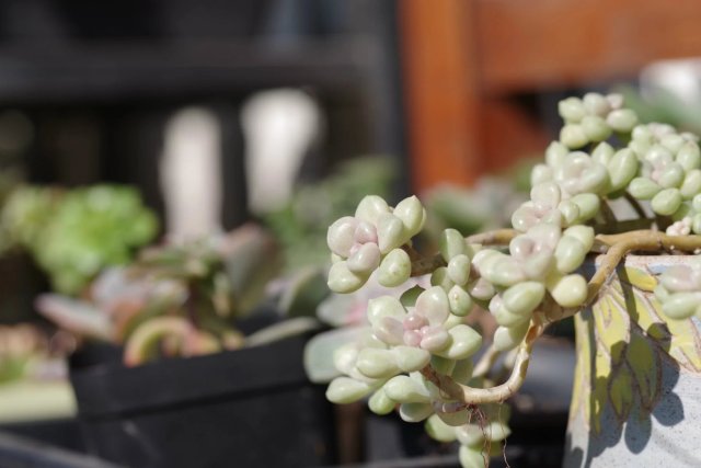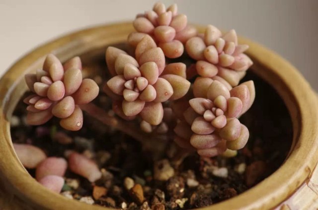 首先,对于新手来说,除了个人喜好,入手多肉最好选一些价廉物美的。所谓价廉物美就是价格不要太贵,比较容易爆盆,让人能有成就感的。就像这个姬秋丽一样,容易爆盆,太阳晒好了,粉粉嫩嫩的果冻色,而且,还会开花。