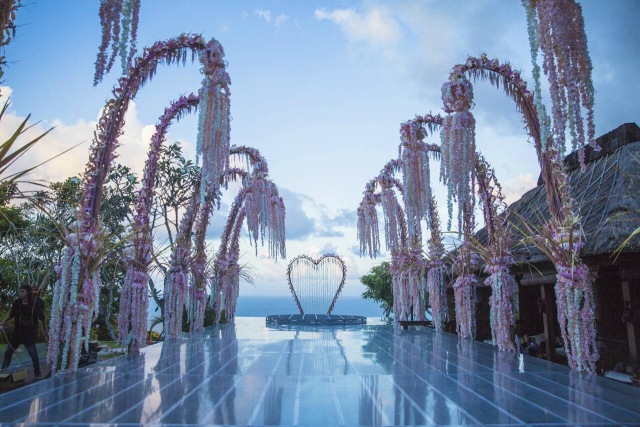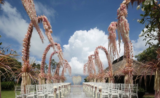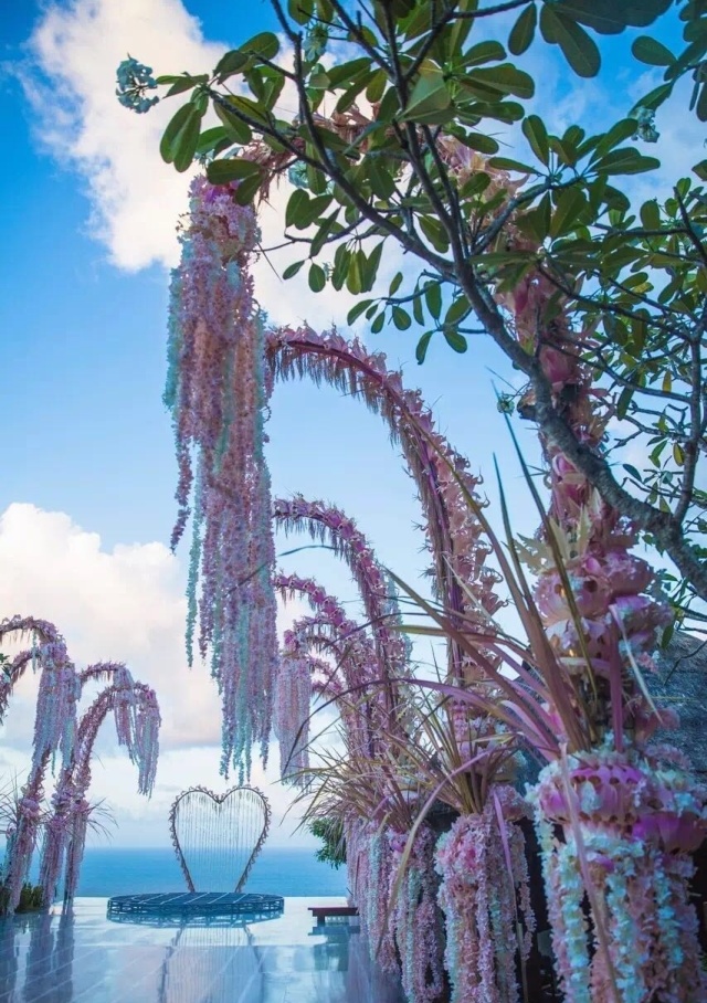从2016年5月20日起,霍迷们就开始碎芳心,从刚公开到通知婚礼再到婚礼的结束,这两个多月,是雷厉风行的两个多月,也是少女们遭受暴击的两个多月。我们华哥先是用一枝并不是玫瑰花的鲜切月季骗走了女神姐姐的芳心。在网友们吐槽着是不是胡歌捣乱给他买错了花的时候,接下来的这场婚礼,大约是华哥蓄力已久的大爆发,毕竟在小编看来,这场婚礼大部分的费用,大概都是花在了这浪漫又温馨的花朵上了吧。从欢迎晚宴上白色和绿色满满的热带风情,主仪式上粉红色让人溢出的少女心,婚纱照和现场繁复但却不冗杂的手捧花,无一不是精致而又温情满满。在婚礼的前一天,巴厘岛上,主人对远道而来的宾客们举行了欢迎晚宴,宴会上除了各家爱豆,亲朋好友以及当地美食之外,宴会餐桌上的花朵也是点睛之笔,毕竟七月的夏天,碧绿翠枝才能清凉解暑。晚宴中的主色调是绿色和白色,它们的分别代表是棕榈叶和绣球花。棕榈叶在晚宴上被做到了最大化利用,设计师们不仅按照着它的颜值美貌被拿来插花做着场景美化,还根据着颜色的深浅不一把它制作成了垫子,放在相应的每一个座位上。 棕榈是一种用途广泛的经济树种。其棕皮能制作棕绳、棕垫、地毯等;嫩叶可编织帽、扇、篮、包。晚宴上的餐垫,就是用棕榈叶编织而成,充满自然的气息。 绣球花的应用也是一大亮点,白色花朵缀在纷纷繁繁的绿叶之间,让整体有着一种从自然到淡雅的过度。 绣球花其实特别适合做新娘的捧花,也有专门以绣球花为主题的婚礼!浪漫的不要不要的! 碧海蓝天下,7月31日的下午两点,正是阳光最热烈的时候,海风吹拂着婚礼主会场,两旁的花卉随着风温柔的摆动,组成心形 。紫藤、鸡蛋花、晚香玉和代表着丰收的麦穗,被绑在巴厘岛的特有植物Penjor上,循序渐进着轻盈摇摆。紫藤本就是绚丽的花朵,虽然叫作紫藤却有着琳琅满目的颜色,在婚礼仪式上频繁出现的紫藤花,白色粉色红色调居多。在仪式结束后的晚宴上,那气势恢宏的50000支紫藤花,高高悬在客厅的天花板上,灵感来自节日的焰火,是器宇轩昂的粉白渐变。 紫藤的花语是醉人的恋情,依依的思念。 相传见证了爱情,做为心灵的花永远垂挂在相爱的人的记忆里。 鸡蛋花,不仅被绑在礼坛两面的Penjor上,也戴在女神的头上,洒落在他们夫妻两位走来的路上,白中透黄,不胜娇羞。 Plumeria rubra cv. Acutifolia人们喜欢将采下的鸡蛋花串成花环作为佩戴的装饰品,很多游客也会把鸡蛋花别在发束上作为装饰,鸡蛋花现在已经是海滩照必备! 那海风送来清凉和芬芳,枝上的晚香玉是在仪式开始前的最后一个小时被绑上去的,犹带着香味的花朵随着清风四处飘扬,进入鼻腔。 晚香玉,又名夜来香、月下香,因为晚上的时候才会散发出浓香味出来,故名晚香玉。晚香玉无论香气或姿态,都显露出尊贵优雅的气质。 在婚礼的当日,紫薇格格手中的手捧花是由一种名为白色奥哈拉花的鲜切月季和千代兰组成的,看起来优雅和精致。