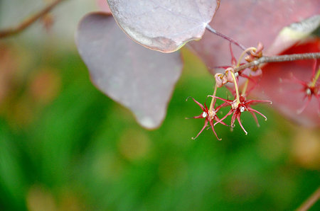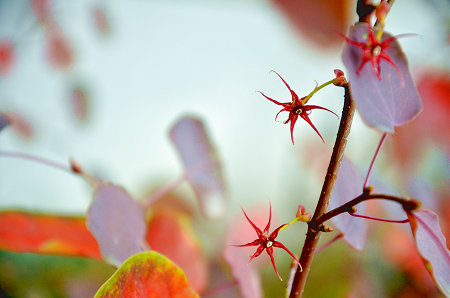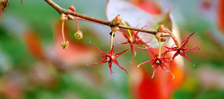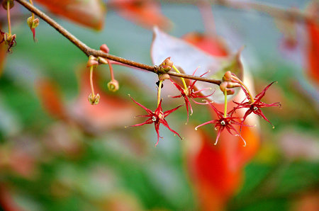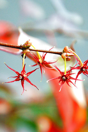 长柄双花木的花精致并呈深红色,花萼5裂,开花时反卷;花瓣狭长带形,好似星芒;雄蕊5枚,花丝远比花要短。春季长叶,页呈宽卵圆形,到金秋季节,树就变成的红色,点缀于青翠的常绿阔叶林间,引人注目。
