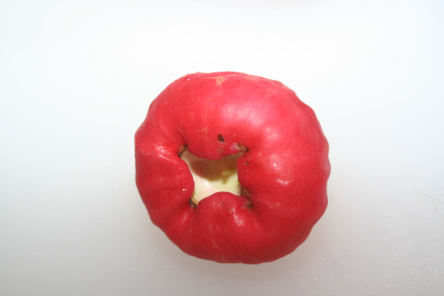 莲雾别名水石榴,从外形看涨的就像石榴的花骨朵一样,果实顶端扁平,下垂状表面有蜡质的光泽。果肉呈海绵质,略有苹果香味。