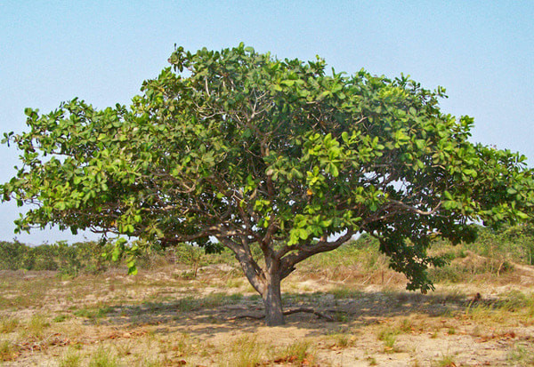 腰果是一种常绿乔木,树干直立,高达10m。小枝黄褐色,无毛或近无毛。叶革质,倒卵形,长8-14厘米,宽6-8.5厘米,先端圆形,平截或微凹,基部阔楔形,全缘,两面无毛,侧脉约12对,侧脉和网脉两面突起;叶柄长1-1.5厘米。