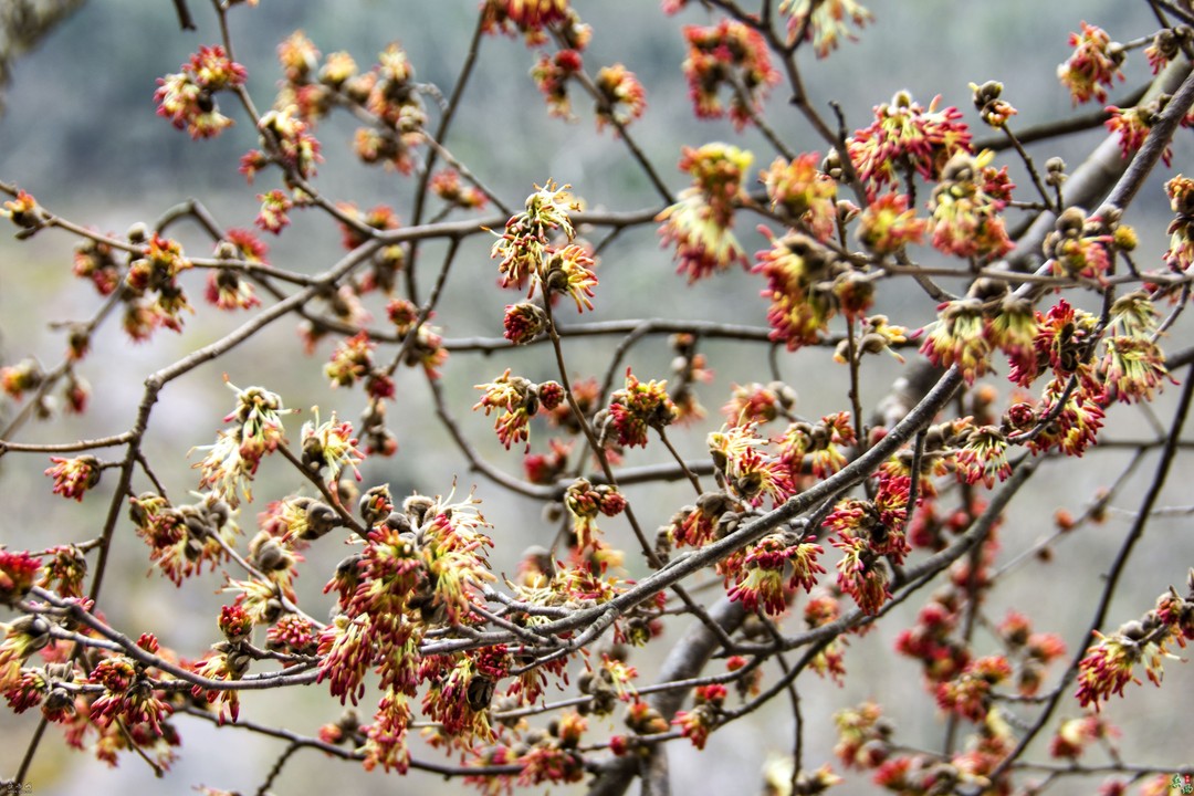 银缕梅在3月中旬开花,先花后叶,花淡绿,绿后转白,花药黄色带红,花朵先朝上,盛花后下垂,远看满树金灿灿,近目的地银丝缕缕。