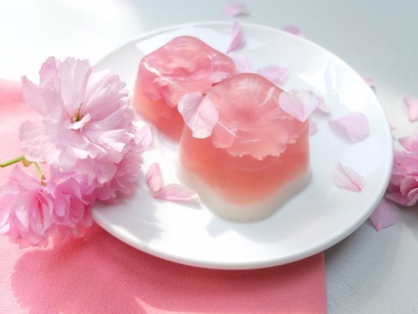 把吉利丁片用冷水泡软备用。日本进口盐渍樱花洗去浮盐,用温水泡开备用。