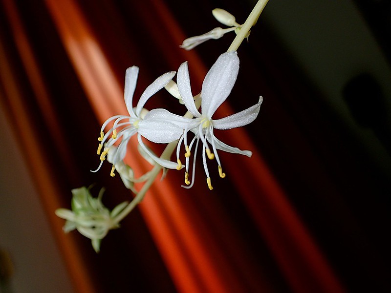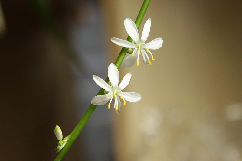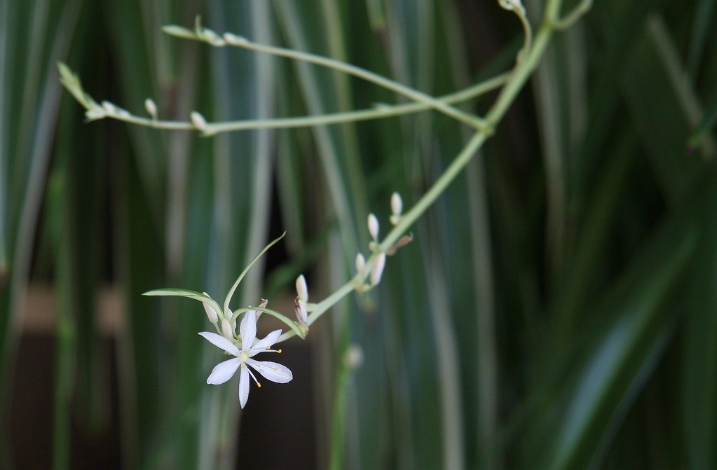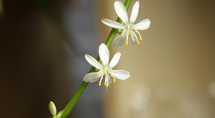 吊兰属的植物(Chlorophytum spp.)是常见的观赏盆栽植物,适应性强,养护简单,并且具有净化空气的功能。叶片四季常绿,多呈条状或披针状,成熟植株常出现匍匐茎(stolons),花朵为白色,花香清雅,一般花期在春夏之间。