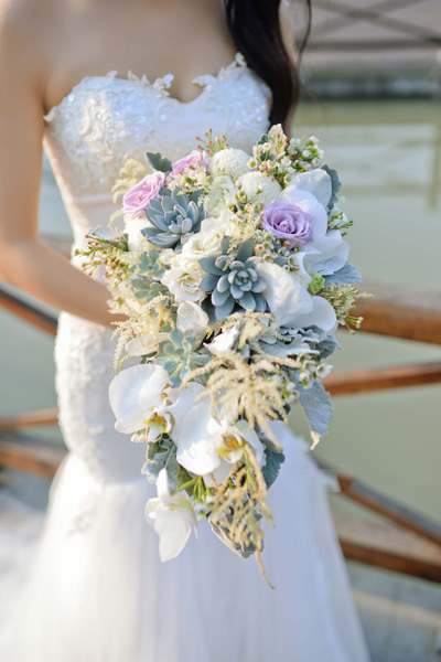 洋桔梗的花期在4—8月,花形酷似玫瑰,在过去的婚礼中常和玫瑰一起作为主花装饰新娘捧花,洋桔梗色彩素雅,配以简洁、优雅的婚纱款式,是端庄新娘的首选,洋桔梗花色丰富,可以于多种花材随性搭配。 除了选花,手捧花还有各式各样的形状,只有想不到,没有不好看啊!小编已经被手捧花整到了恨嫁的程度啊!(虽然小编还是单身狗,汪汪~)