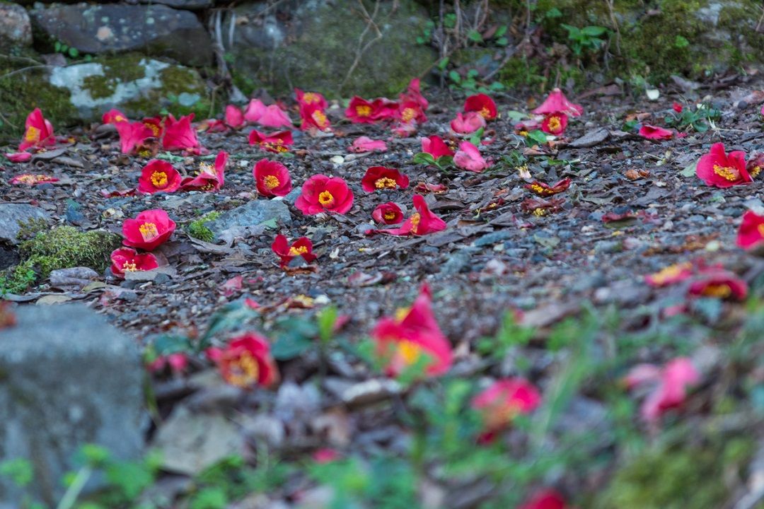 和茶梅不一样,日本山茶花凋落的时候不是花瓣一片片落下,而总是整朵落下。花落的时候,鲜红的花朵铺满地面,颇为壮观。 日本人一直觉得这和砍头有所关联,所以极少将其用作切花。