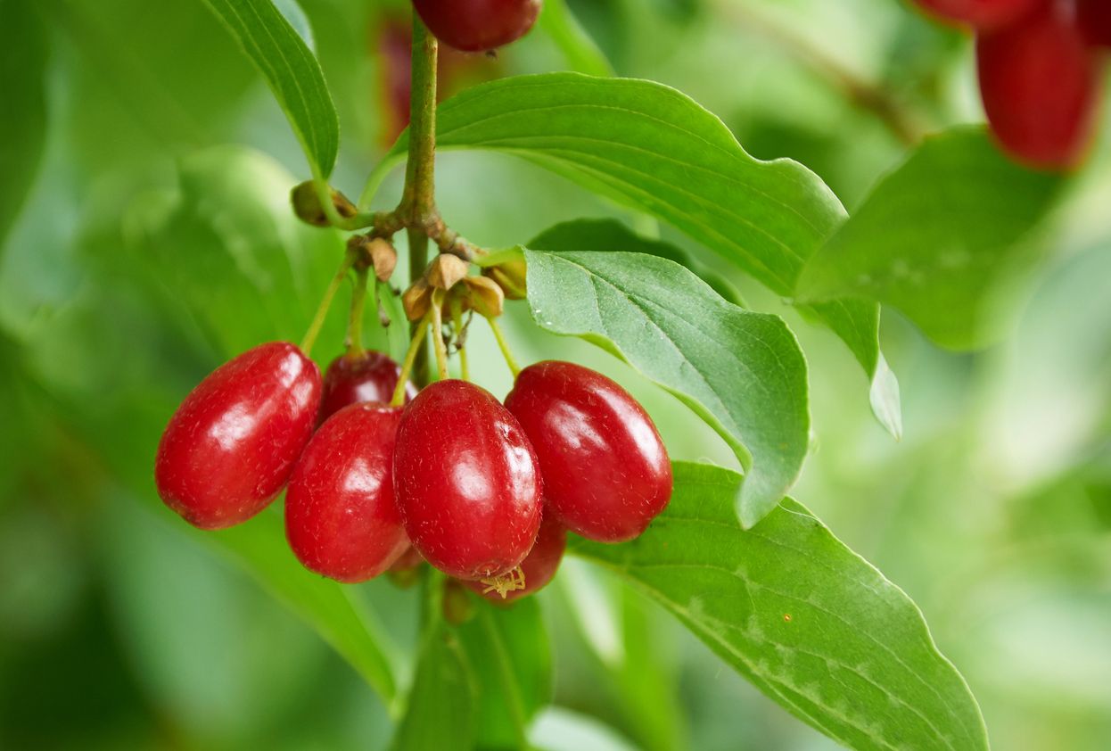 大果山茱萸是大型灌木,早春开黄花,浆果于仲夏熟透。它们半透明的果实不仅漂亮而且美味,可鲜食也可酿酒。英文里的红玛瑙(Cornell)一词即源自这种植物的果实。
