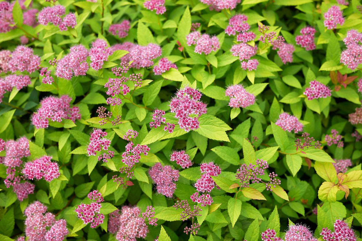 粉花绣线菊,叶细花繁,分枝力强,生长强健,耐修剪,是理想的花篱材料。它们的栽培品种里,既有60cm高的矮化品种,又有1.5m高的大型品种。
