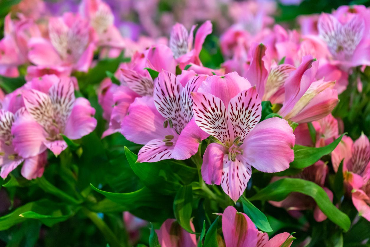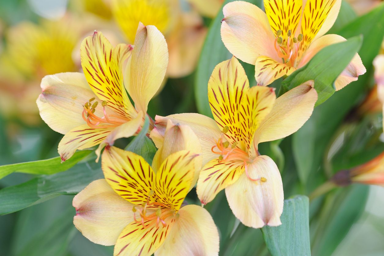 六出花(Alstroemeria × hybrida)是原产于南美洲的多年生草本花卉,是最常见的鲜切花种类之一。它们的花瓣朝上卷,内轮花瓣上有紫色或红色的条状斑点——这是它们的标志。