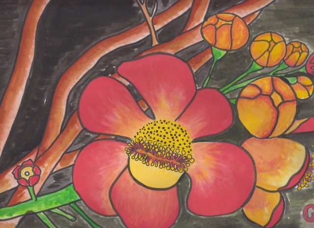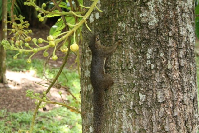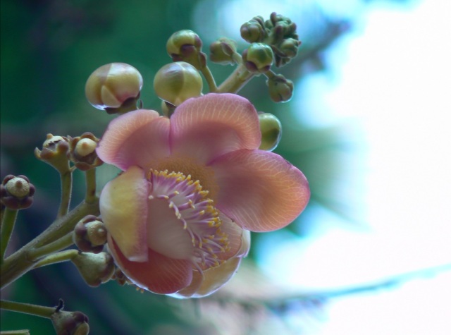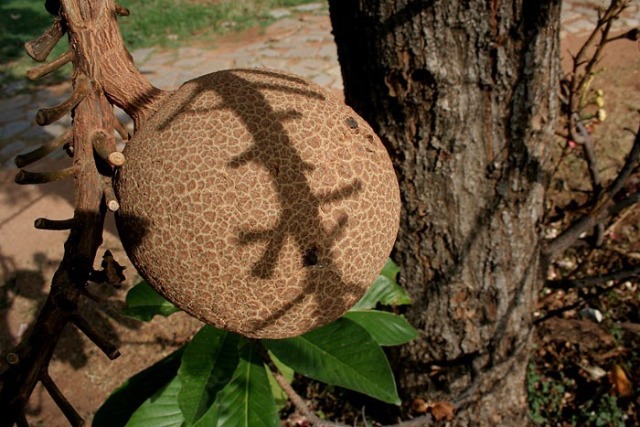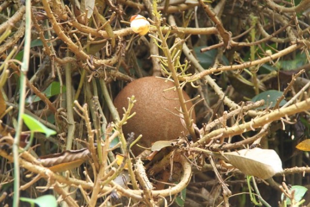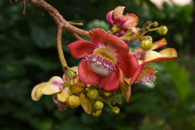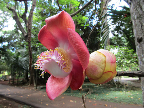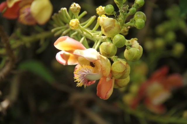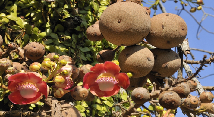 今天想和大家分享下一种奇怪的植物——炮弹树!它的名称来自英文名称Cannonball Tree。Cannonball就是炮弹的意思:形容这种树的棕黑色的大果实,状如炮弹。网上流传当果实成熟的时候,可爆裂,声如炮弹发射,威力强大,周围几十米范围的人,都会深受其害!!上图就是炮弹树的花。花盛开的时候,十分狂野,犹如穿上大花裙的妖娆舞娘,场面香艳无比。花的中间像舌头一样的,是由许许多多雄蕊下部合生而成。可爱的小松鼠是来吃成熟而未开放的花苞的,看,有几个已经被吃掉了。炮弹树花没有花蜜,而且是异型雄蕊。蜜蜂进入花朵时腹部及脚会朝向不孕性之雄蕊收集花粉,背部及头部朝向可孕性雄蕊,离去时同时带走两种花粉,一种带回巢中, 另一种花粉于造访另一朵花时将可孕性花粉传至下一朵花雌蕊之柱头。炮弹树的花臭,对蝙蝠也有很大的吸引力,蝙蝠于是成为炮弹果授粉繁衍的主力。炮弹树的果实是球形的,成熟的果实呈茶褐色,就像是生锈的古代炮弹。炮弹树的果实喂养家畜和家禽,人亦可食用,但因令人不悦的气味而不为人们所喜欢。果实成熟后,落地就会爆开,发出臭味。果子若烂熟,也会臭不可闻,类似腐肉,所以炮弹树别名“臭树”。这个玩意有点像放大版的粪球(屎壳郎用手搞的那种)!熟了的果子掉到地上,有的会摔得皮开壳裂,里面的肉核黑而硬,落地的时候会冒出粉末状的白烟,类似炮弹爆炸的效果。炮弹果成熟的果壳很硬,类似晒干的葫芦。当地居民还用炮弹果的壳做瓢舀水,也算物尽其用吧。本文来自微信公众号形色识花,部分内容由形色用户琳琳提供。