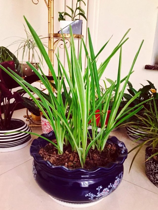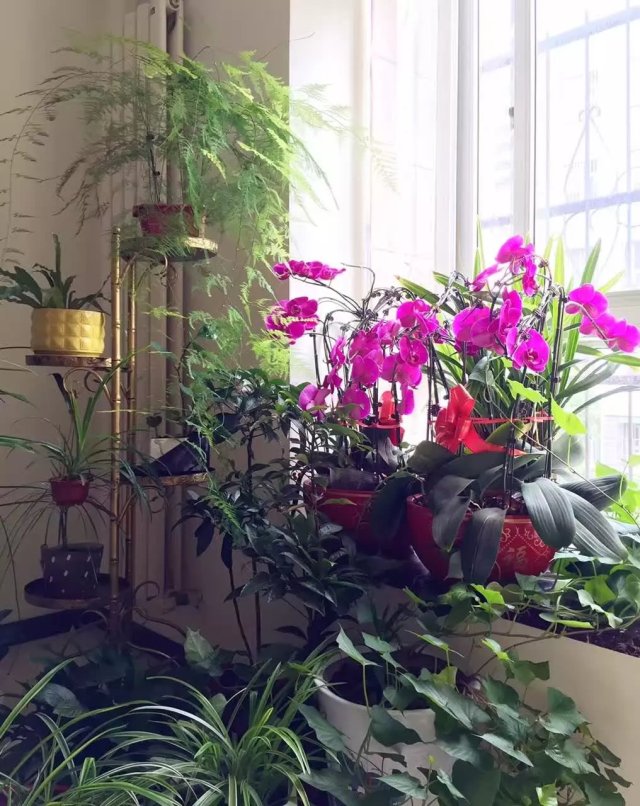 客厅一角的文竹、蝴蝶兰、鸟巢蕨、千年木、碧玉、吊兰、墨兰、红薯叶~