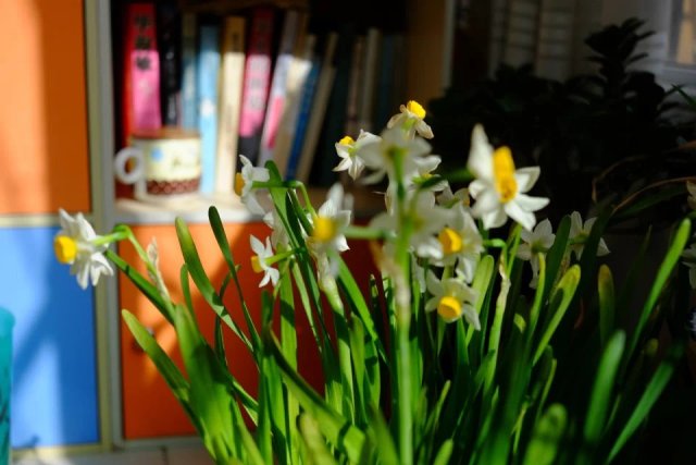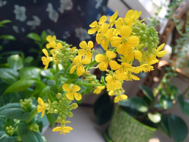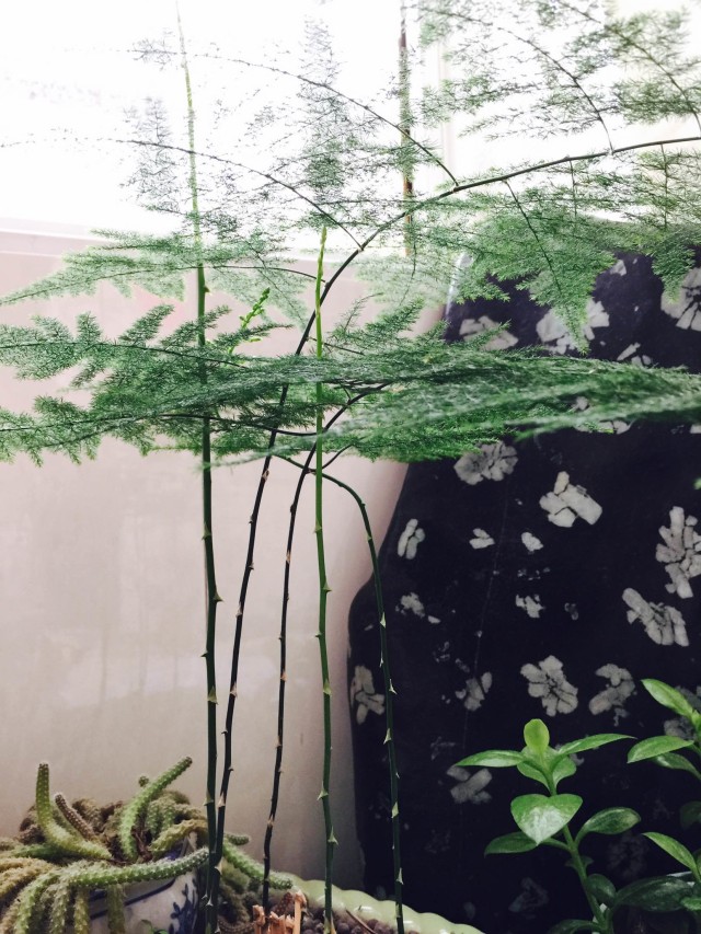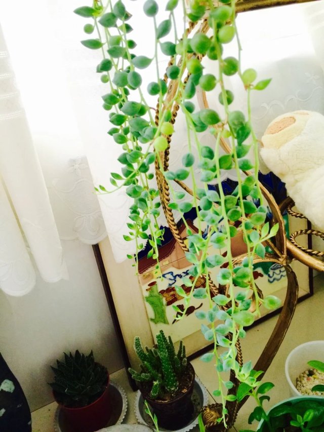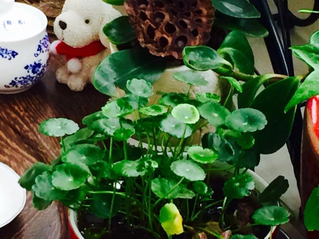 冬天,一棵大白菜吃到最后,留下根部放在水里,你会看到慢慢长高及至这嫩黄的花。喜欢文竹,虽看起来像书生那么羸弱,却有一副铮铮傲骨,挺拔而有节气,这盆跟着我已整整十年,有时疯长的不行,修了再发,发了再修,已成了我生命中不可缺的一分子。路边的野草我要采,覆盆草摘进盆里,垂的这么长,快赶上了绿萝~