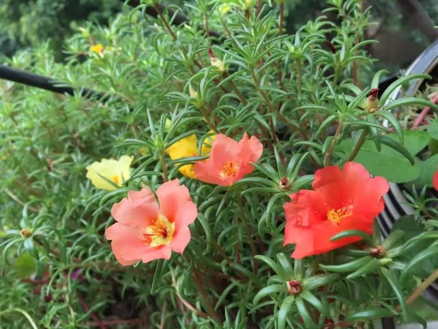 大花马齿苋,俗名太阳花,种上一年,来年花盆里就自然生长了,极其好养,一年年在窗外开出团团簇簇各色花儿,纷彩异呈。