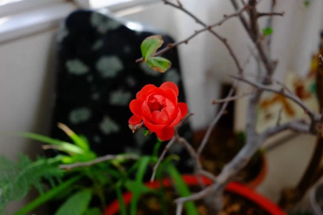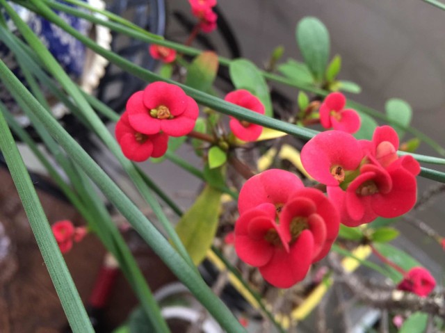 这盆虎刺梅也好几年了,一年四季花开不断,到了冬天,叶子几乎落光了,花儿还是此起彼伏。