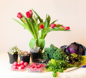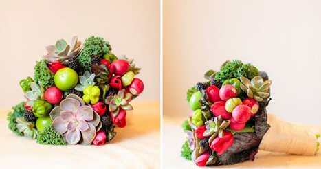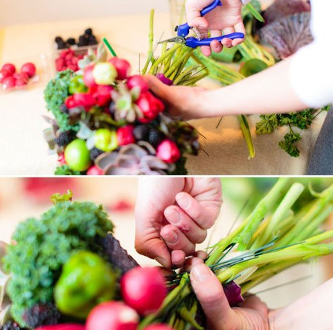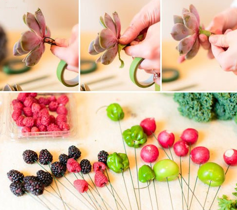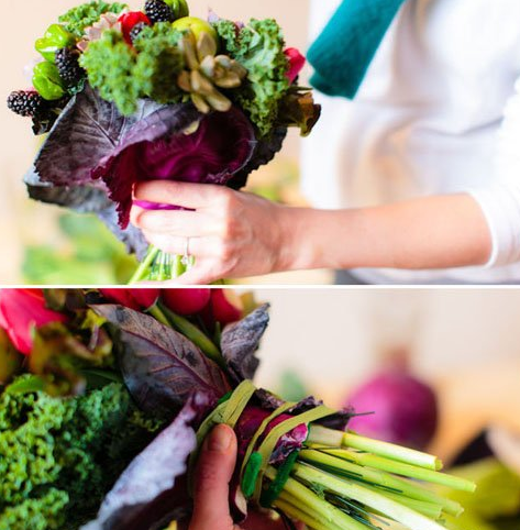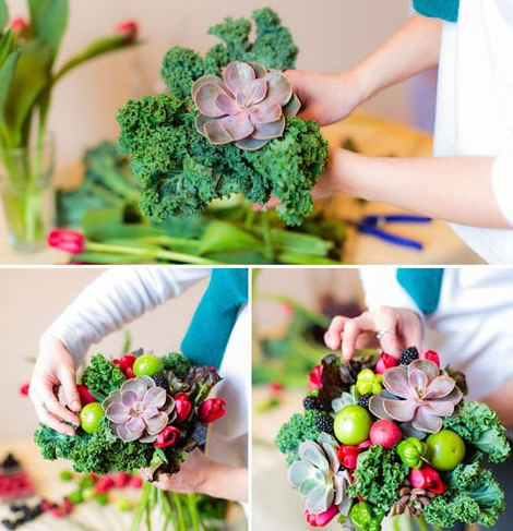 最后,一束像模像样的手捧花就会出现在机智的宝宝面前啦!觉得稍微有点粗糙的地方也可以稍微修剪一下,觉得空隙大的部分可以多放一点猴猴看的满天星进去哦!多肉植物是很多宝宝的心头好,做一束多肉手捧花一定会让来到婚礼的小伙伴们大吃一惊的!这样的多肉手捧花里,看不到玫瑰,看不到风信子和满天星等经典因素,但是!好看啊!好看啊!好看啊!两个绿番茄、三个辣椒、一些芥菜、一些卷心菜(只需要一些大的叶子)、几只红色郁金香用一些细的小棍子插在蔬菜或者水果的底部起固定作用,去除掉一些植物根茎的多余部分。可以用一些叶子包裹在外面。这样又好看又能固定住花束。