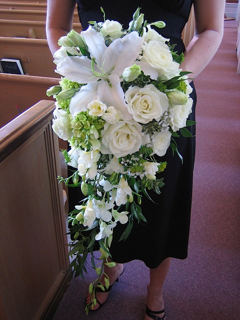 瀑布式花束,下垂部分的花枝,需要频繁地安插铅丝,所以在浸湿花托内的花泥后,要将铅丝穿过泥座的边缘并旋转固定,以备安插下垂部分的花枝~~~由于捧花花托的下端是一个小手柄,因此为便于插花,可以将花托手柄插入矿泉水瓶或者口径较小的饮料瓶内(小编有没有很机智!!!)插花的顺序是先插百合,再插配叶,最后插玫瑰。捧花的下垂部分主要由百合和星点木组成。鉴于百合的花形较大,通常插下垂部分时,选用含苞待放的百合,和星点木错落有致地安插于花托底部的花泥上,并用之前穿好的铅丝缠绕固定。