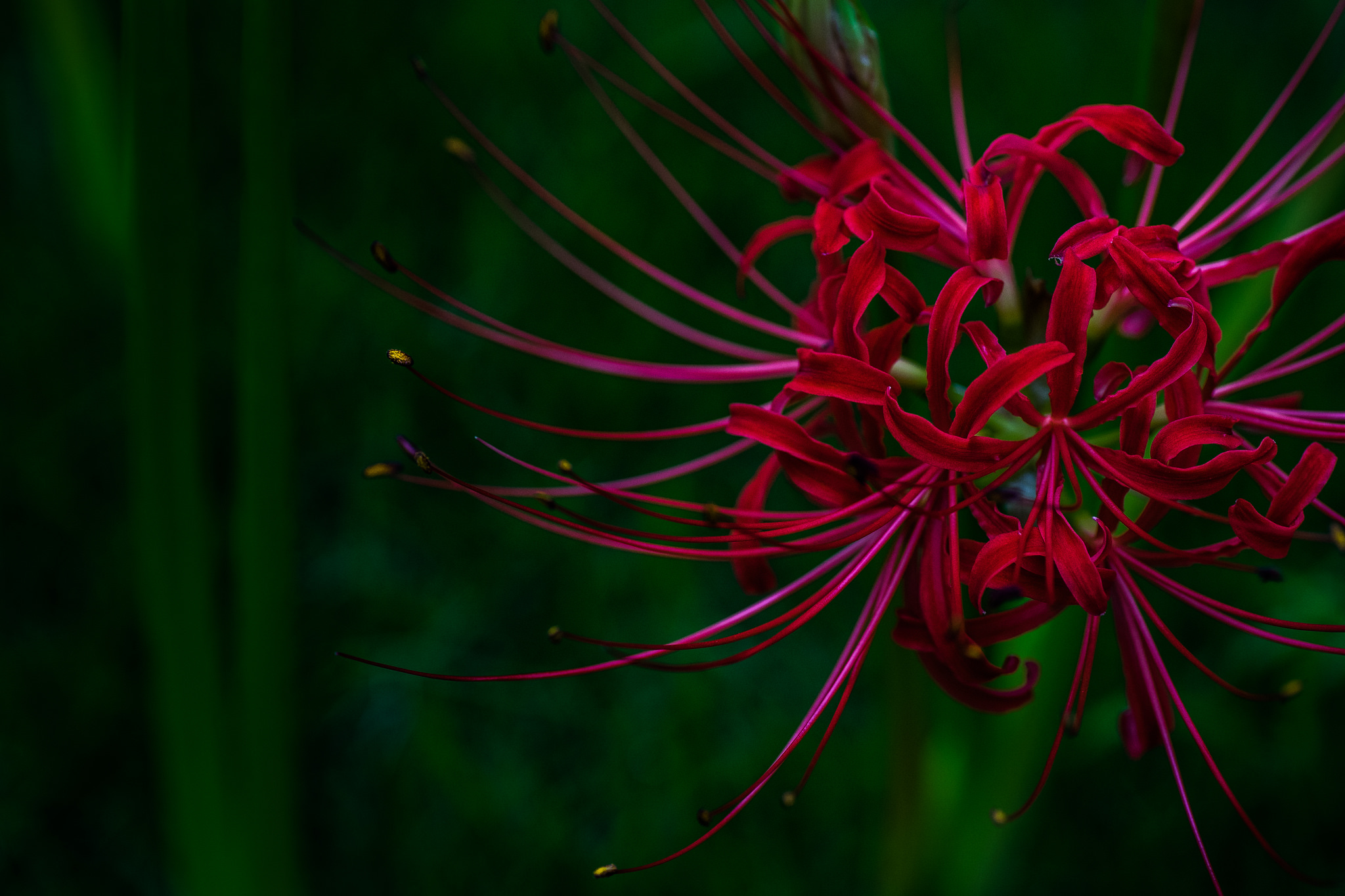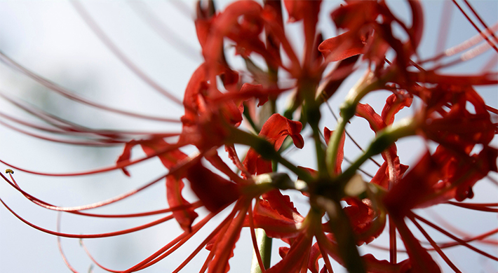 彼岸花的花朵凋落后,叶子才会生长出来,花和叶是不能相见的,仿佛预兆着没有结果的爱情,虽然热烈,但终究别离。