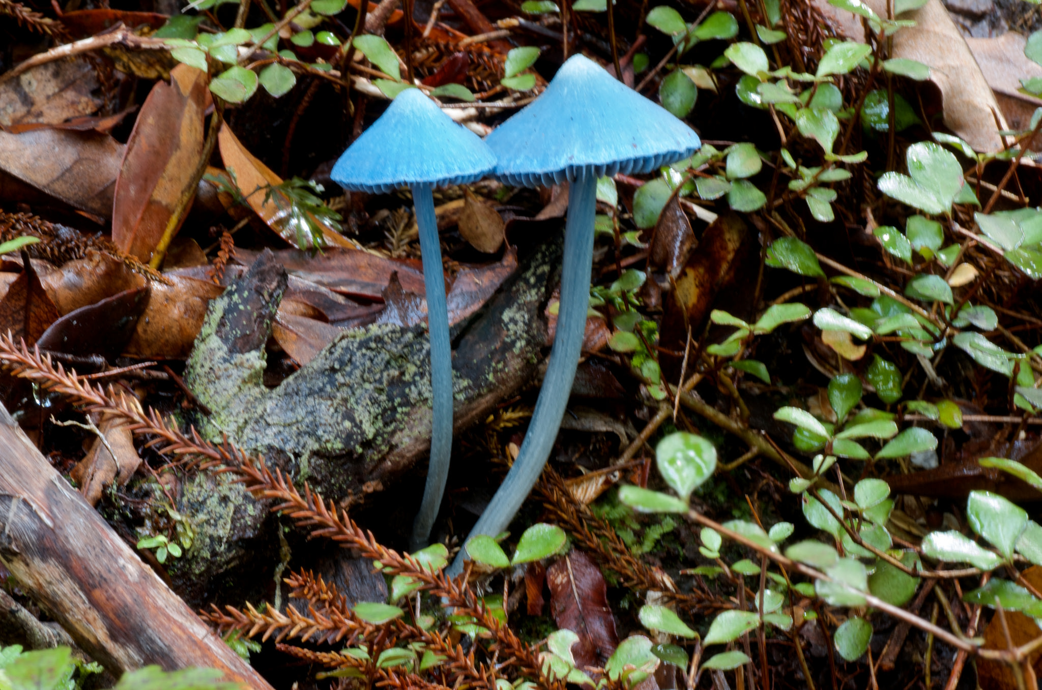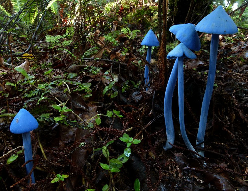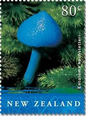 然后我才弄清楚:一个广西小伙,失恋之后,录了一段地域风格鲜明的视频……这个颜色亮丽的小蘑菇,叫天蓝蘑菇,大名是霍氏粉褶菌(Entoloma hochstetteri),是一种担子菌门真菌,隶属于粉褶菌。它主要生活在新西兰和印度,主打蓝色,只有孢子菌褶略带红色。天蓝蘑菇的蓝色外衣很是迷人,它是由3种类色素所致。看着这小尤物,吃货一定会毫不犹豫地问“能(吃吗?)好(吃吗?)怎(么吃?)”,很遗憾地告诉你,天蓝蘑菇不可食用,是否有毒现在还是一个未知数。2002年,新西兰发行了一套涵盖6种本地菌种的邮票,其中就有天蓝蘑菇。这种蘑菇也出现在新西兰储备银行1990年发行的50元钞票的背面。